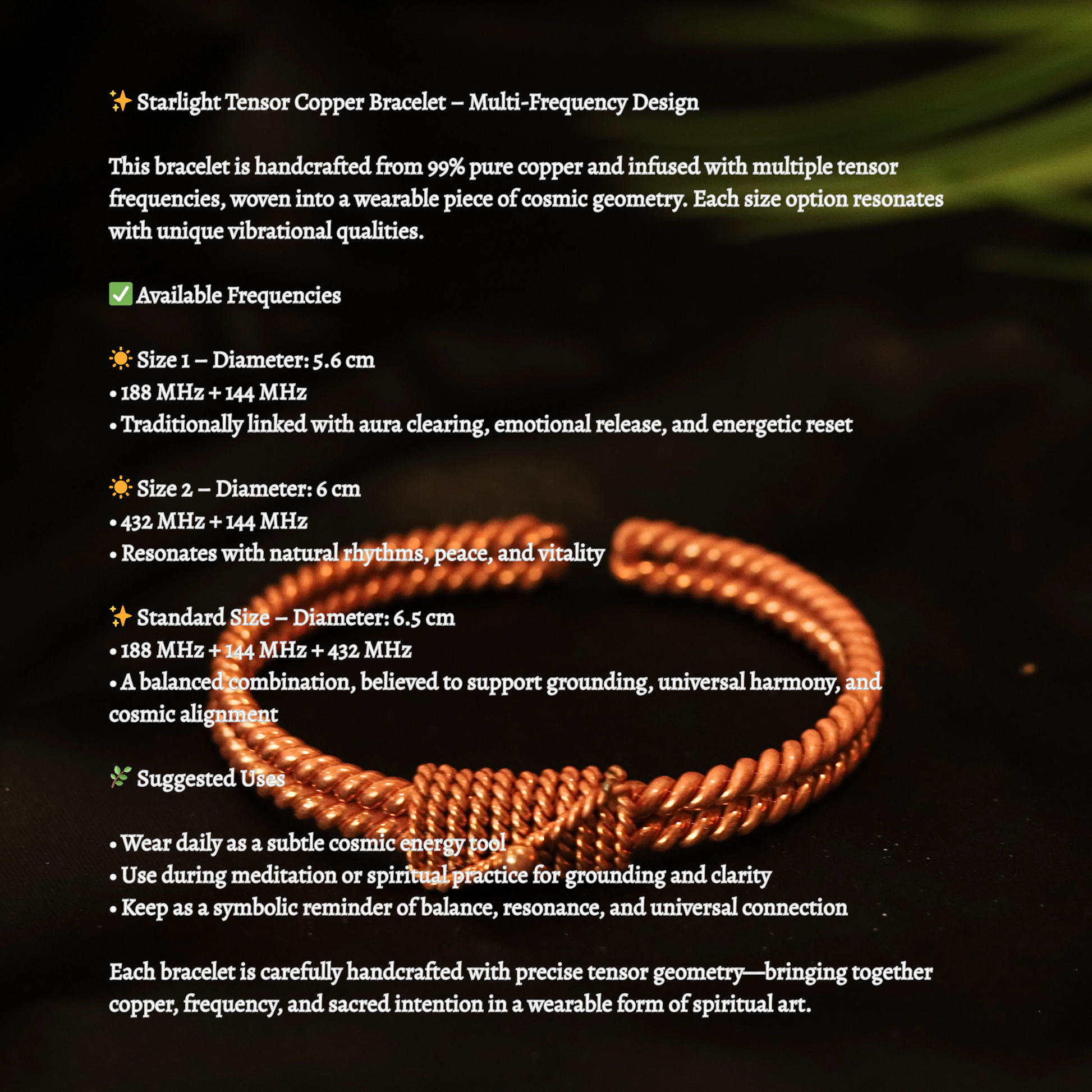 This bracelet is handcrafted from 99% pure copper and infused with multiple tensor frequencies, woven into a wearable piece of cosmic geometry. Each size option resonates with unique vibrational qualities.