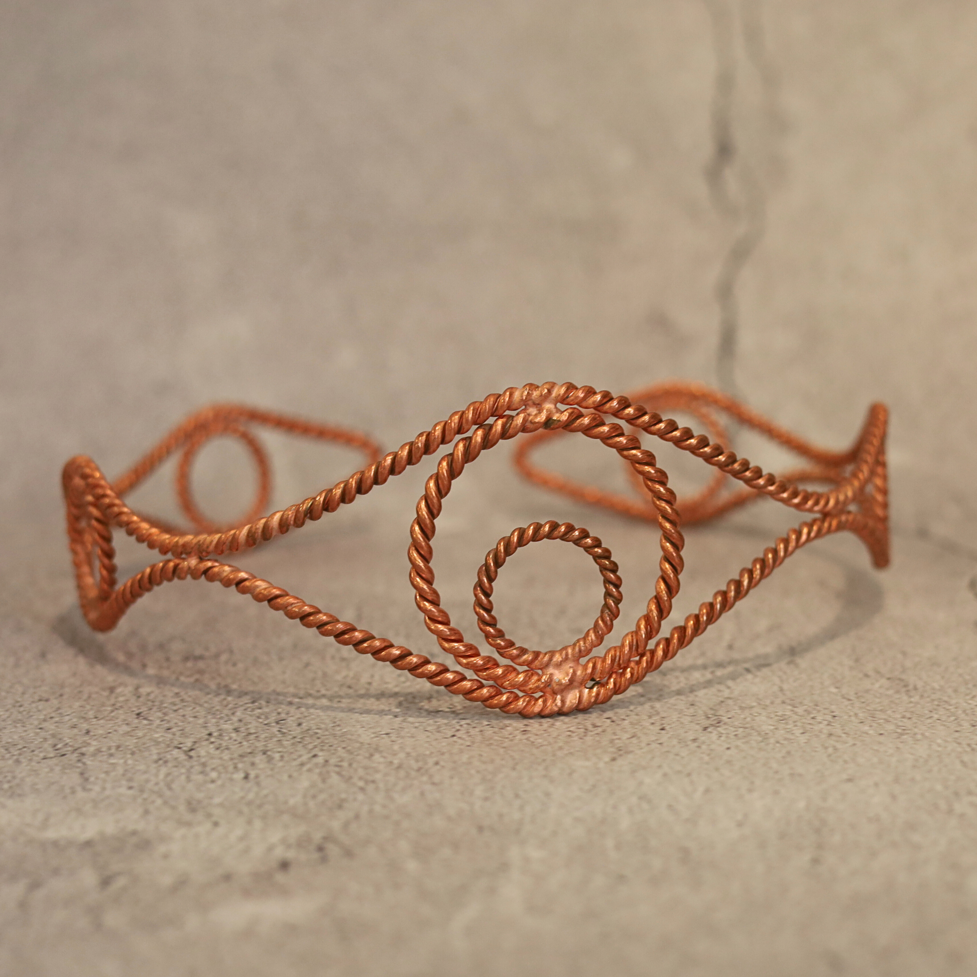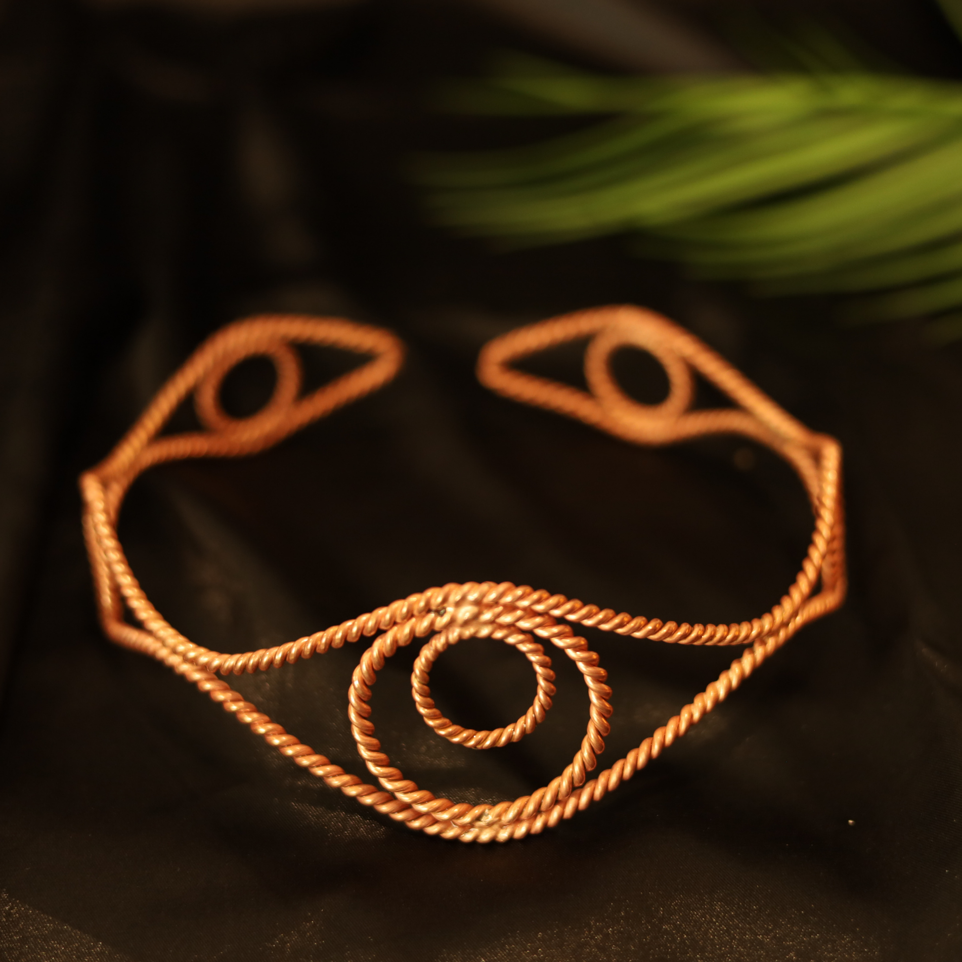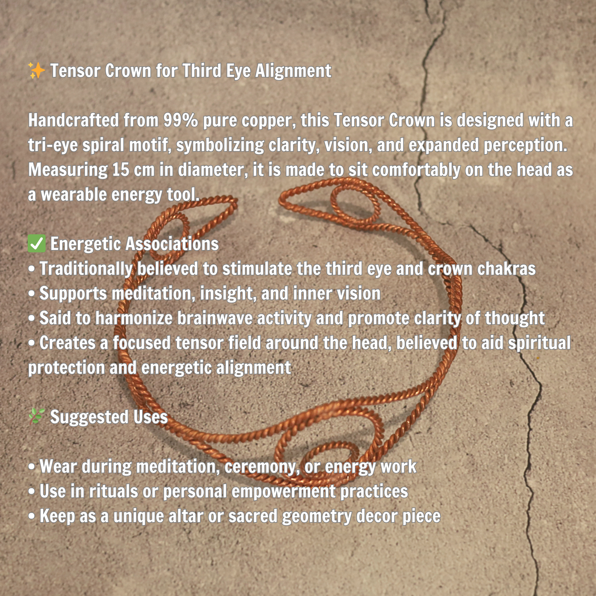 Handcrafted from 99% pure copper, this Tensor Crown is designed with a tri-eye spiral motif, symbolizing clarity, vision, and expanded perception. Measuring 15 cm in diameter, it is made to sit comfortably on the head as a wearable energy tool.
